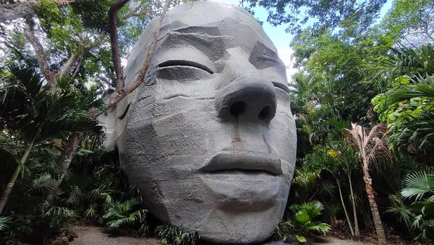 Al cruzar la entrada, como si de un portal se tratara, debes bajar unas cortas escaleras para adentrarte al túnel que termina en otras escaleras de regreso a la superficie. Una vez del otro lado, a tu izquierda te encontrarás con la primera instalación: una cabeza maya prehispánica gigante tallada en piedra, que reposa a la orilla de una pequeña laguna natural con agua traslúcida.