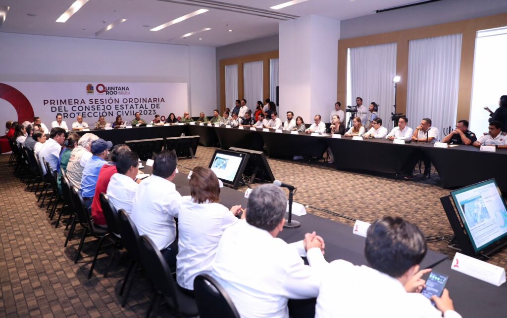Cancún.- La gobernadora Mara Lezama Espinosa presidió la Primera Sesión Ordinaria del Consejo Estatal de Protección Civil, en donde llamó a sumar fuerzas y acciones institucionales para la mitigación, prevención, coordinación y comunicación en caso de presentarse un fenómeno hidrometeorológico para salvaguardar la integridad de la ciudadanía.